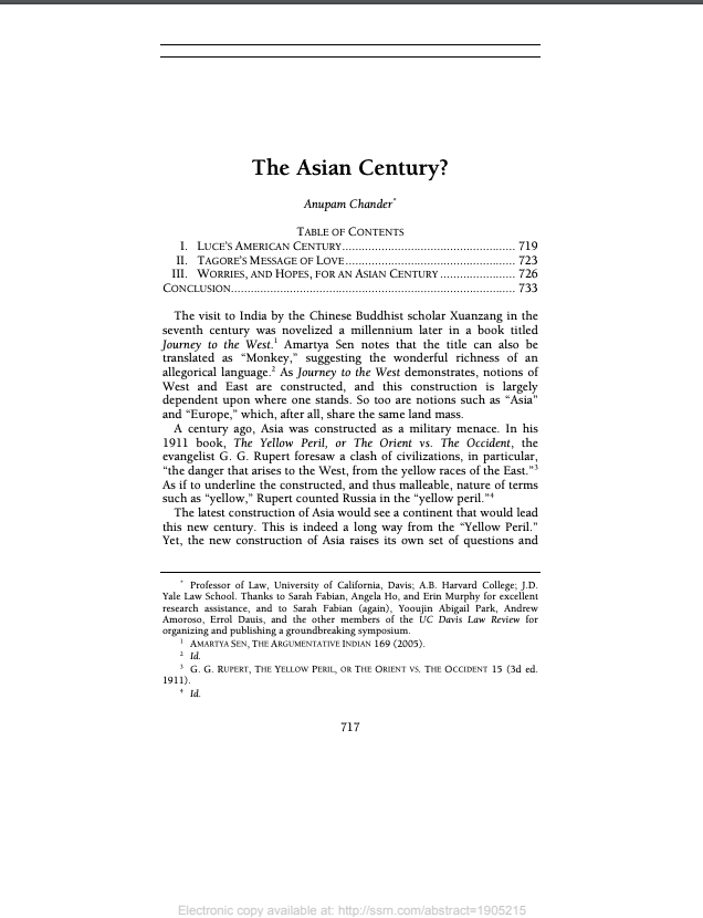 How might an Asian Century to come differ from the American Century just past? Will an Asian Century, should it come to pass, mark a retreat for human rights, including women’s rights and gay rights? In this introduction to a UC Davis Law Review symposium, I contrast Henry Luce’s vision for an American Century with the internationalism of his near contemporary, the Indian Poet Laureate Rabindranath Tagore. As the United States entered World War II, Luce, publisher of Time, Life, and Fortune, asked, “What are we fighting for?” Luce’s manifesto declaring an “American Century” answered that it was the internationalization of American ideas - promulgated from Hollywood to Washington. Luce’s vision presaged American support for human rights after the war and its forceful, if inconsistent, critique of despots during the latter half of the Twentieth Century. In the Post-War era, China and India embraced the sovereign nation-state, often proving reluctant to support intervention in the affairs of other countries, even when human rights were at stake. Tagore offered an alternative vision. Hailing from a land that long suffered at the hands of British traders and imperialists, Tagore proposed an internationalism led by neither the merchant nor the soldier. Instead, Tagore offered a world order founded on a kind of critical friendship, unflinchingly focused on human dignity for all.